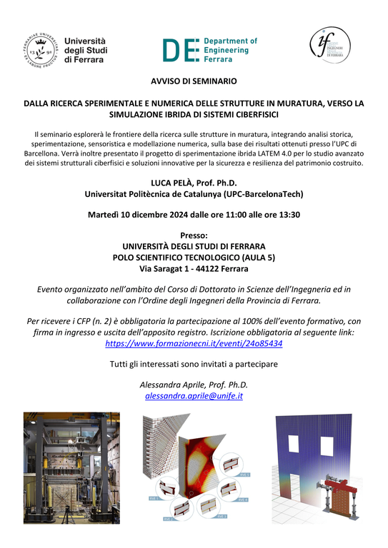 Martedì 10 dicembre 2024 Luca Pelà, prof. PhD dell' Universitat Politècnica de Catalunya, terrà il seminario Dalla ricerca sperimentale e numerica delle strutture in muratura, verso la simulazione ibrida di sistemi ciberfisici.